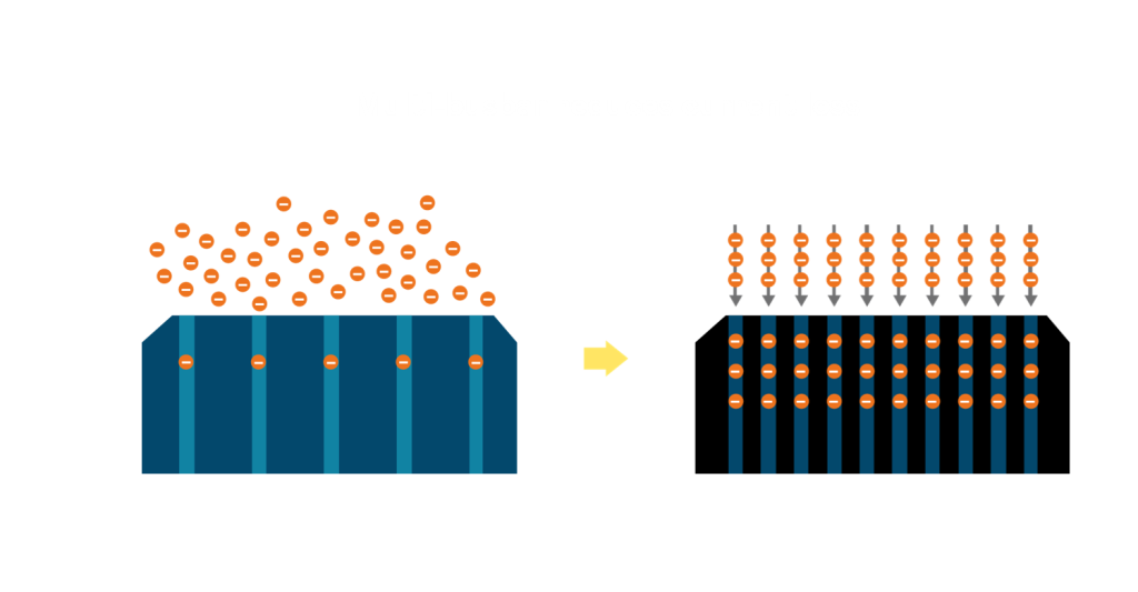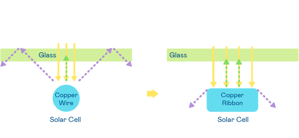 电池使用多条铜导线 (Copper wire) 于电池片上形成较短的电流路径,提高电流收集效率,采用圆形设计的铜导线较传统扁平式的铜焊带 (Ribbon),可增加入射至电池的光线量。