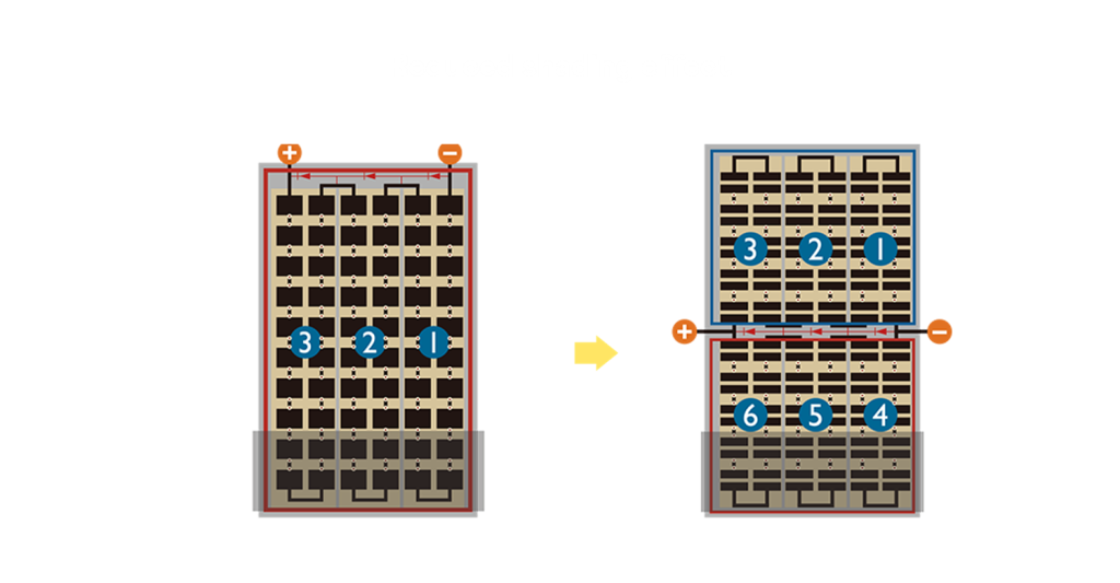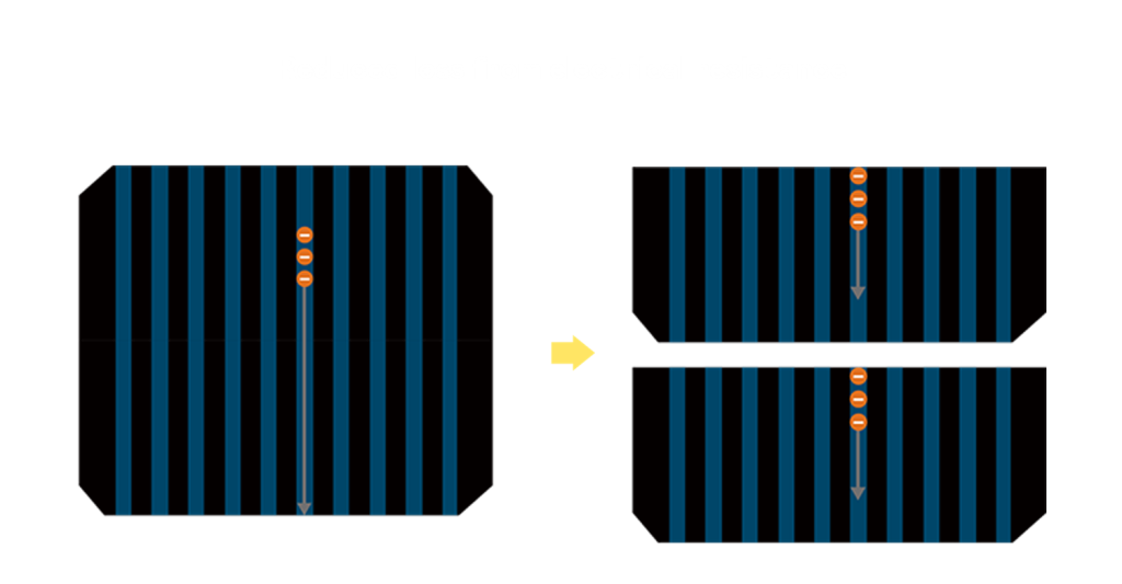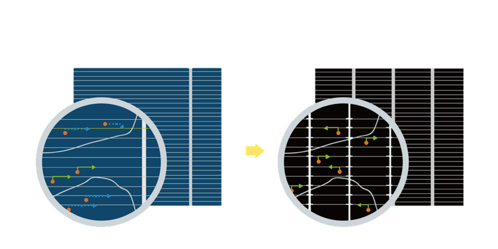 结合半切电池,降低遮阴影响、提升模组抗隐裂能力、并减少电阻损耗,进一步提升模组发电效能。