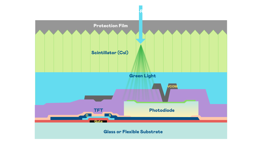 J9九游会的X光影像感测阵列使用薄膜电晶体 (TFT) 作为每个像素的读取开关,搭配光电二极体(Photodiode)的光电转换元件,用以感测X光影像讯号。